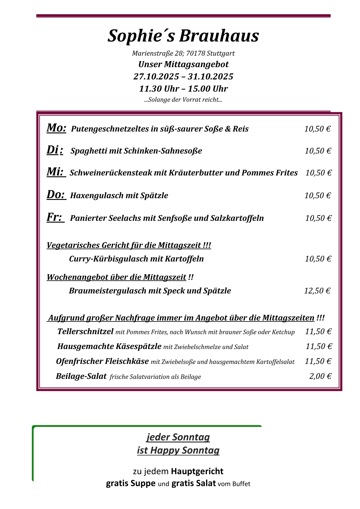 Jeden Sonntag ist Happy Sonntag! Zu jedem Hauptgericht gratis Suppe und Salat vom Buffet.